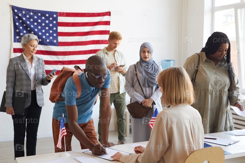 Люди, регистрирующиеся на избирательном участке