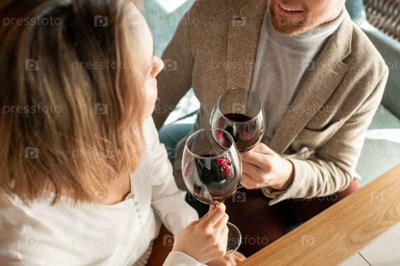 Молодые романтические свидания звучат со стаканами красного вина, сидя за столом