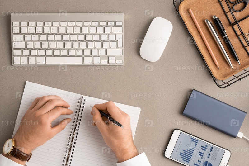 Флатлей рук элегантного брокера с пером на пустых страницах открытой тетради