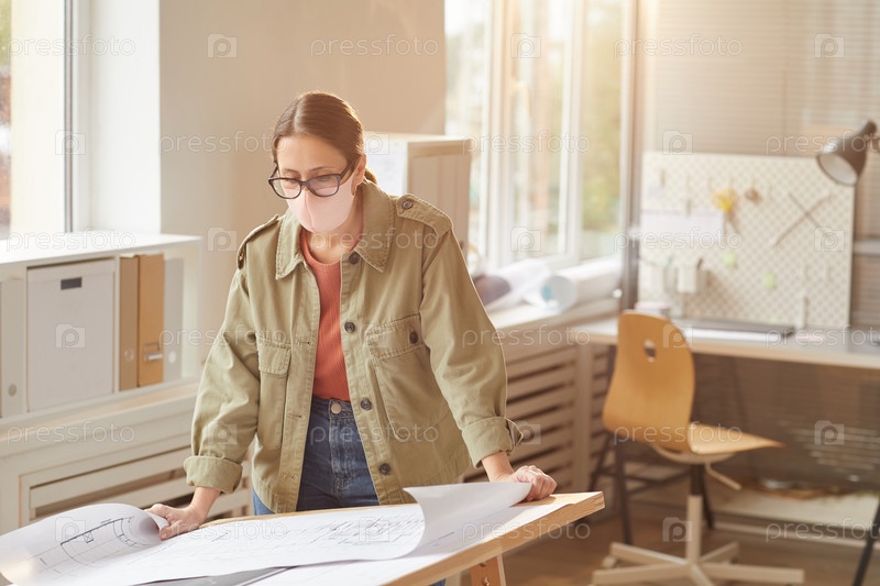 Женщина-дизайнер носит маску в офисе