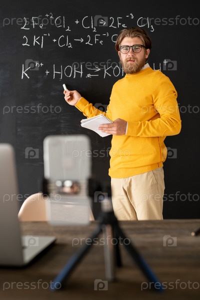 Бородатый учитель химии в повседневной одежде, указывающий на химическую формулу