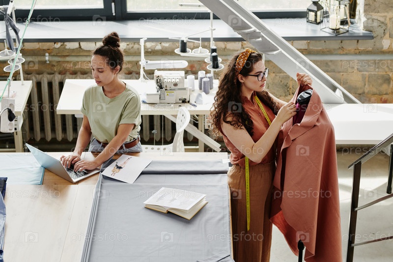 Молодые серьезные модные дизайнеры работают над новой сезонной коллекцией пальто