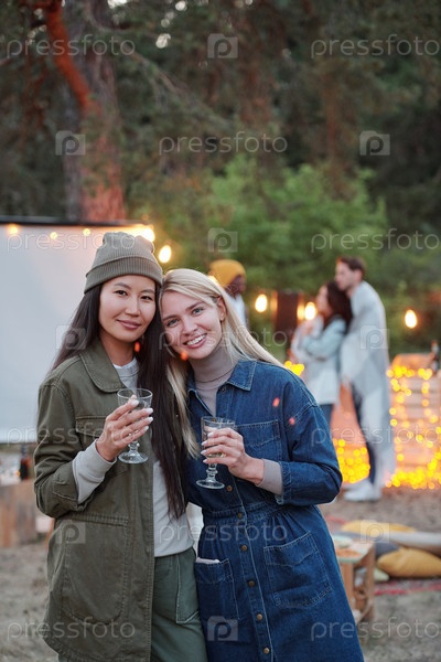 Две счастливые девушки с напитками, оживленными в то время как они стоят рядом друг с другом