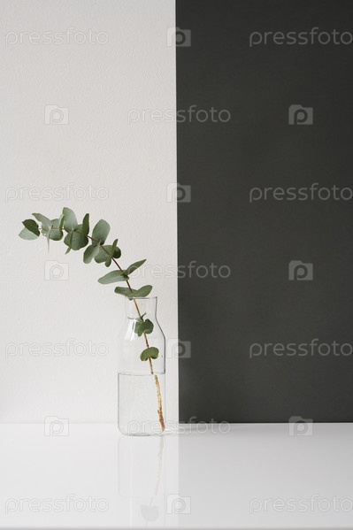 Современная минималистическая натюрмортовая композиция ветви растения в стеклянной вазе, черно-белый фон, копировальное пространство