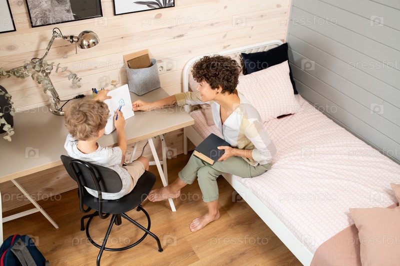 Молодая мать с книгой сидит на кровати рядом со столом, где ее сын показывает фотографию