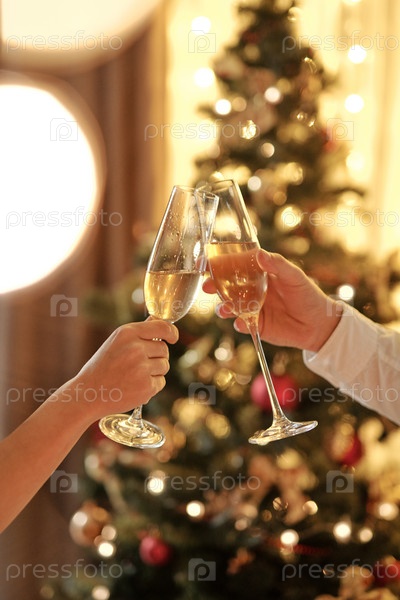 Руки пары, звучащие с флейтами шампанского во время тостов на Рождество