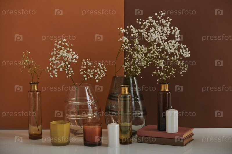 Красивая ароматическая натюрмортная композиция с цветами в стеклянных сосудах и парфюмерными свечами на коричневом фоне