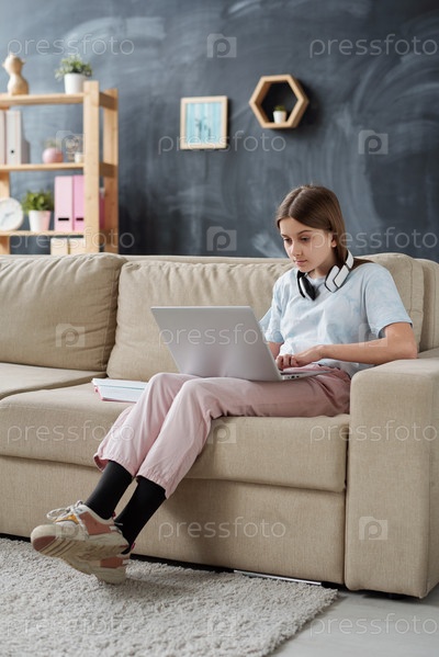 Милая студентка-подросток в повседневной одежде смотрит на дисплей ноутбука