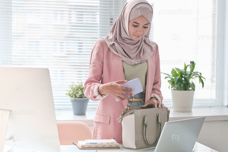 Молодая красивая мусульманка, управляющая офисом, кладет смартфон в сумочку