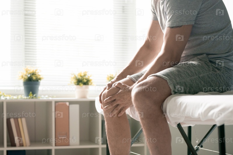 Современный спортсмен в активной одежде массажирует правое колено травмированной ноги