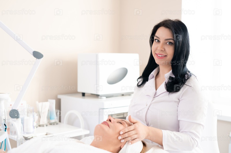 Косметолог делает массаж лица клиенту