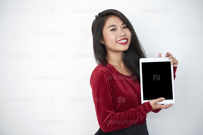 Азиатская модель держит планшетный ПК