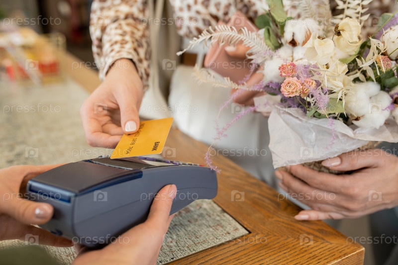 Рука молодой покупательницы с букетом цветов, оплачивающей цветки