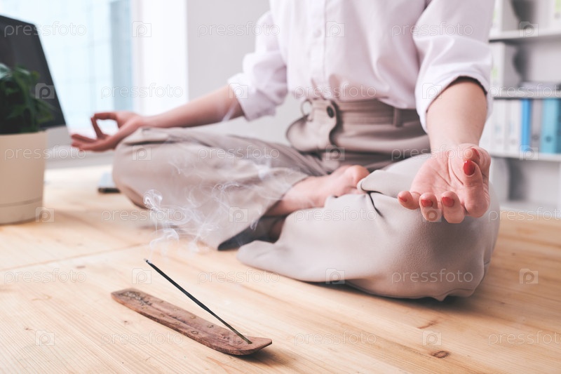 Руки и скрещенные ноги медитирующей молодой бизнес-жены в формальной одежде