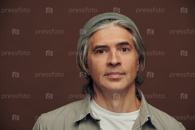 Портрет серьезного хорошо выглядящего зрелого мужчины с седыми волосами, носящего хипстерскую шляпу на коричневом фоне