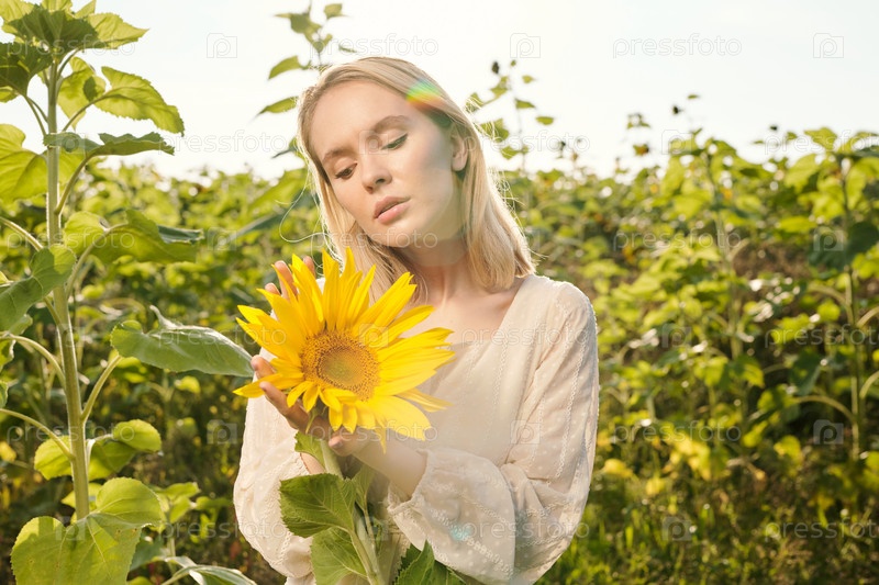 Красивая молодая блондинка в деревенском платье стоит перед камерой