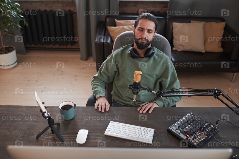 Горизонтальный высокоугольный средний портрет современного молодого ближневосточного блогера, сидящего за столом и смотрящего что-то для реакции видео