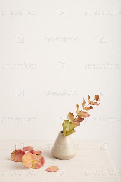 Ветка красивого растения с зелеными и розовыми листьями в маленькой вазе на белом фоне стены, копирование пространства