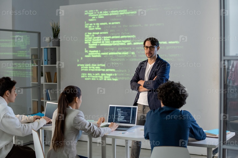 Преподаватель университета со скрещенными руками на груди делает презентацию