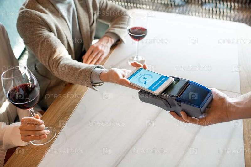 Молодой человек держит смартфон над платежным терминалом, оплачивая ужин