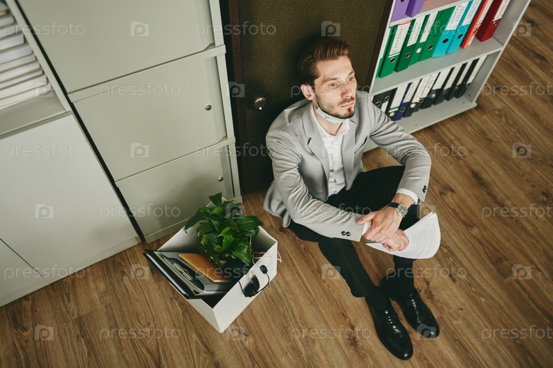 Стрессовый молодой брокер с документами сидит в сейфе во время кризиса после карантина