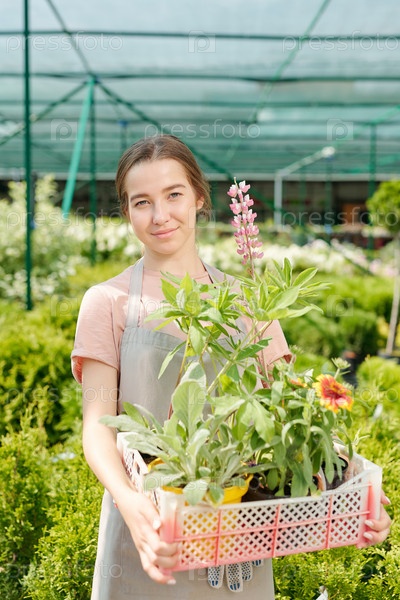 Молодая счастливая женщина-работница теплицы или сада, держащая пластиковую коробку с цветами