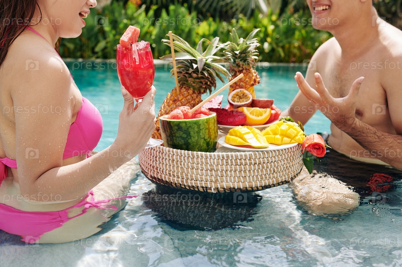 Пара наслаждается фруктами в бассейне