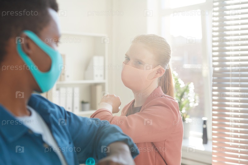 Молодая женщина приветствует коллегу в офисе после пандемии