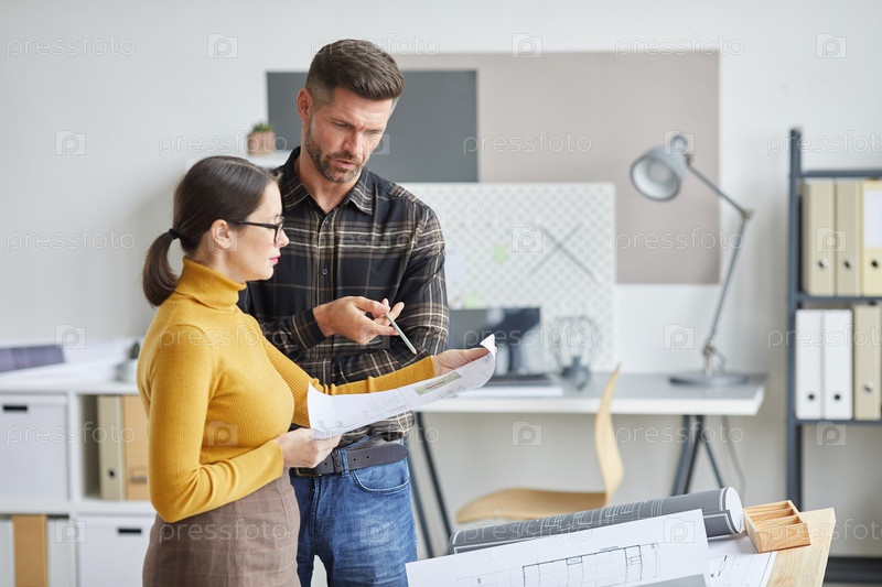 Два архитектора сотрудничают над планами в офисе