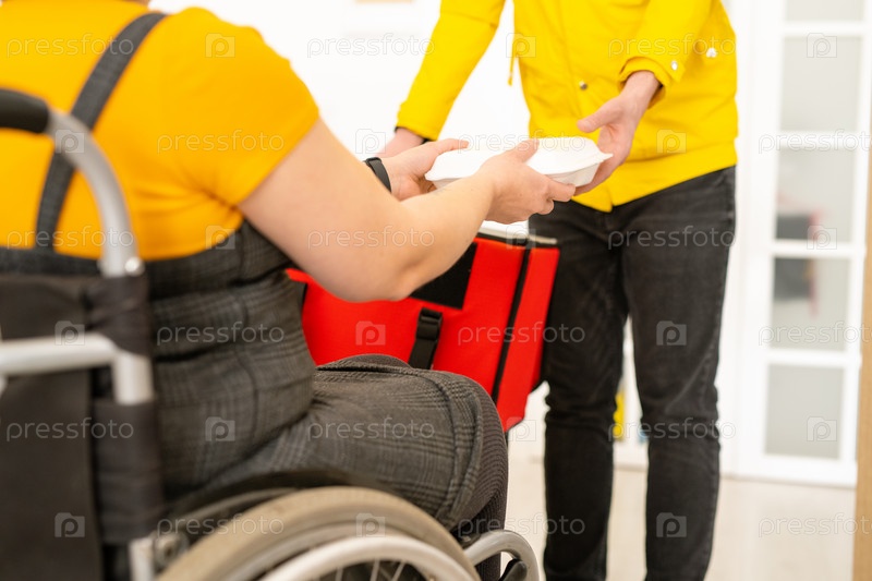 Молодой курьер с большой сумкой передает пластиковый контейнер с едой женщине-инвалиду