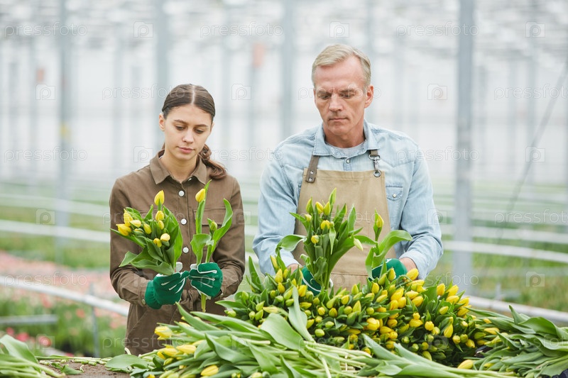 Работники, сортирующие цветы на плантации