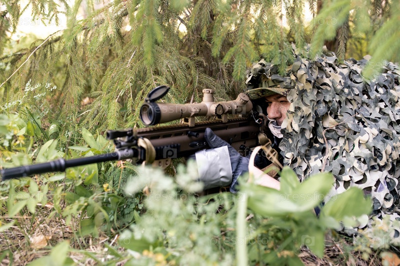 Снайпер смотрит через прицел винтовки