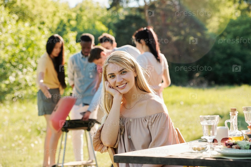 Красивая блондинка на фоне межкультурных друзей готовит барбекю