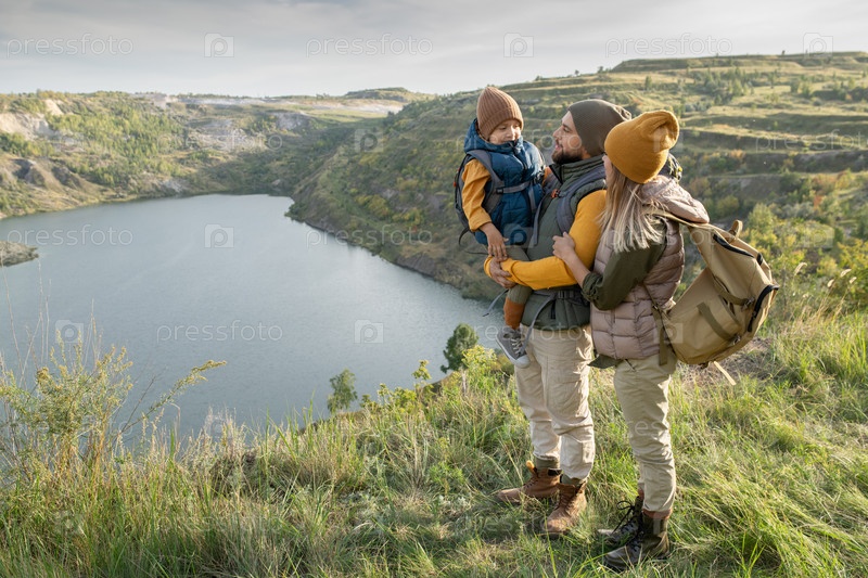 Молодые родители и их маленький сын с рюкзаками, стоящие на озере или реке