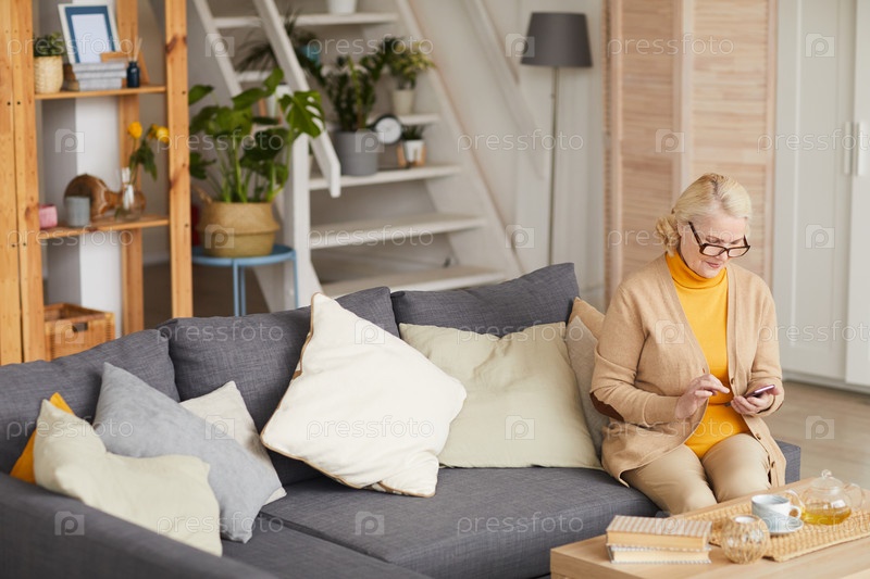 Пожилая женщина, использующая телефон дома