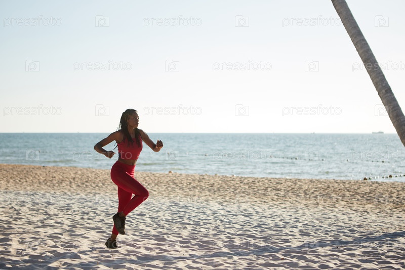 Женщина бегает по песчаному пляжу