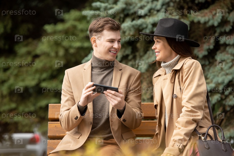 Счастливый молодой стильный мужчина со смартфоном и его красивая девушка разговаривают