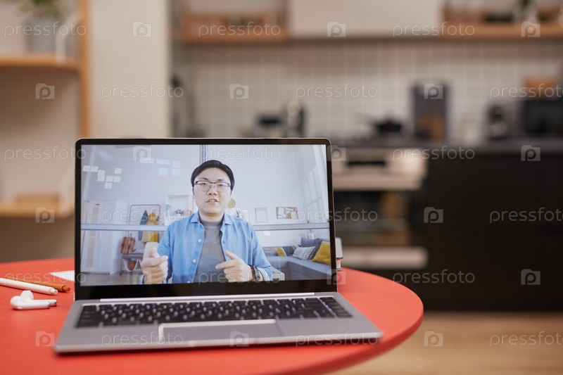 Азиатский мужчина говорит во время онлайн-встречи или класса