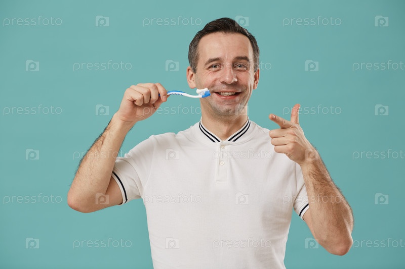 Портрет счастливого мужчины, чистящего зубы на синем