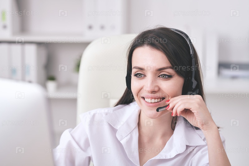 Молодая веселая представительница службы поддержки клиентов с гарнитурой