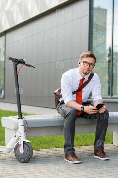 Счастливый молодой спокойный бизнесмен со смартфоном, сидящий на скамейке снаружи