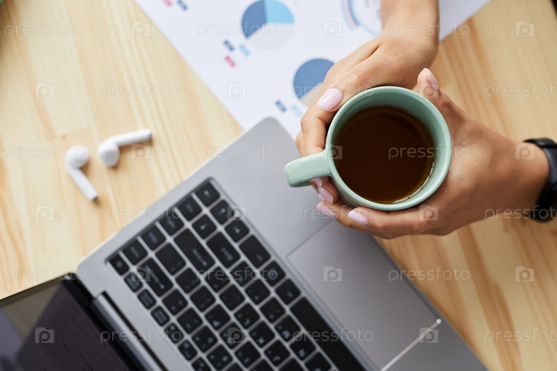 Женщина держит чашку кофе, работая из дома