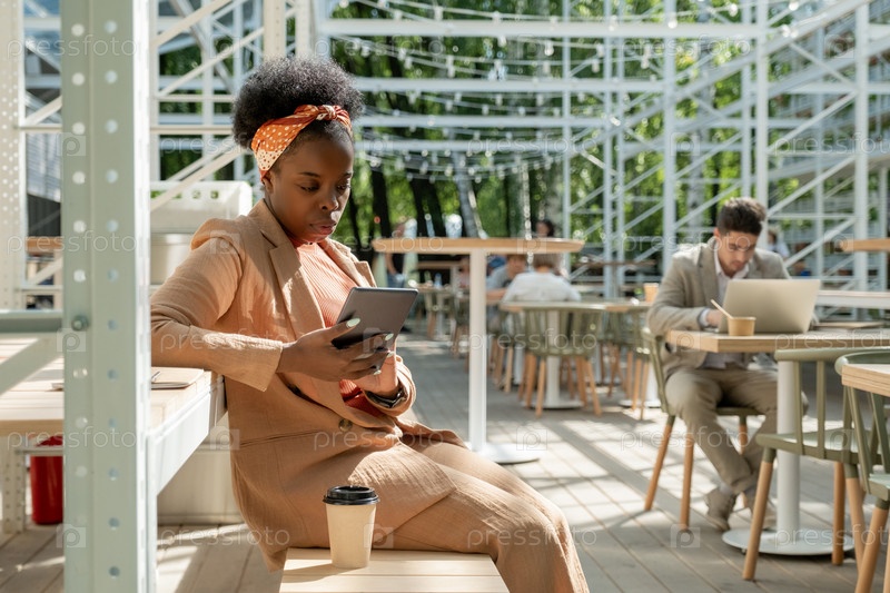 Молодая элегантная женщина африканской этнической принадлежности пьет и серфирует в сети