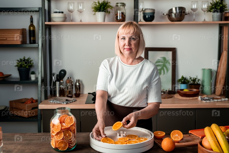 Домашняя хозяйка средних лет в футболке и фартуке кладет нарезы апельсина на фруктовый сушильник