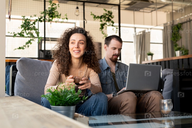 Счастливая молодая спокойная женщина с чашкой чая или кофе, глядящая в окно