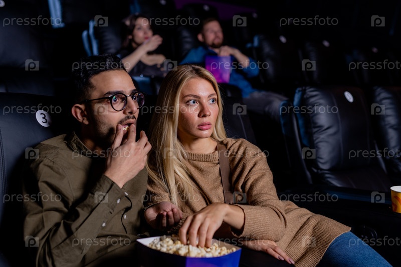 Молодые напуганные свидания с коробкой попкорна смотрят фильм ужасов в свободное время