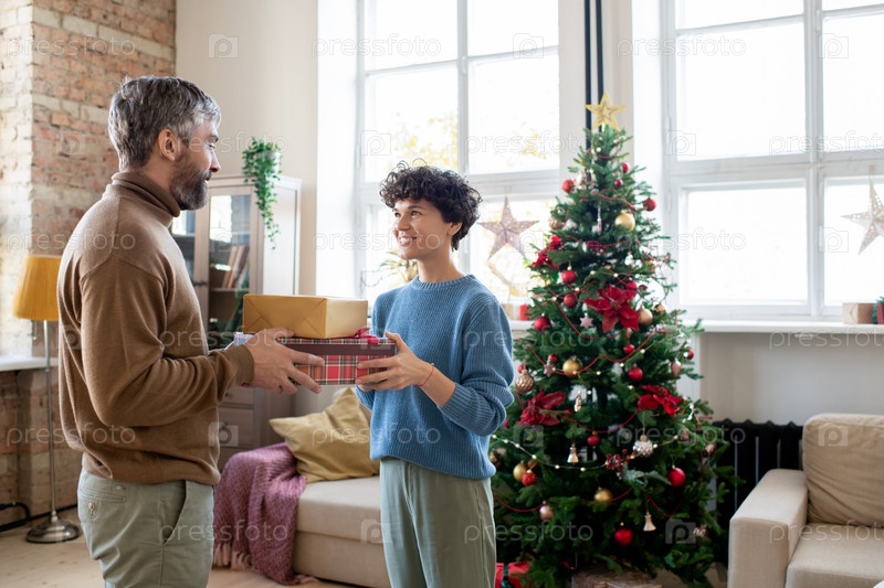 Молодая женщина с карими кудрявыми волосами, передающая мужчине рождественские подарки