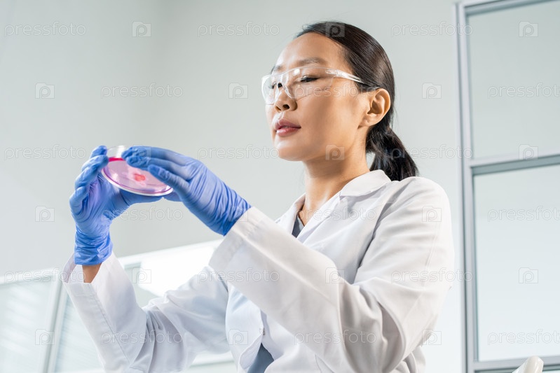 Работница лаборатории держит чашу Петри с крошечным образцом сырого растительного мяса