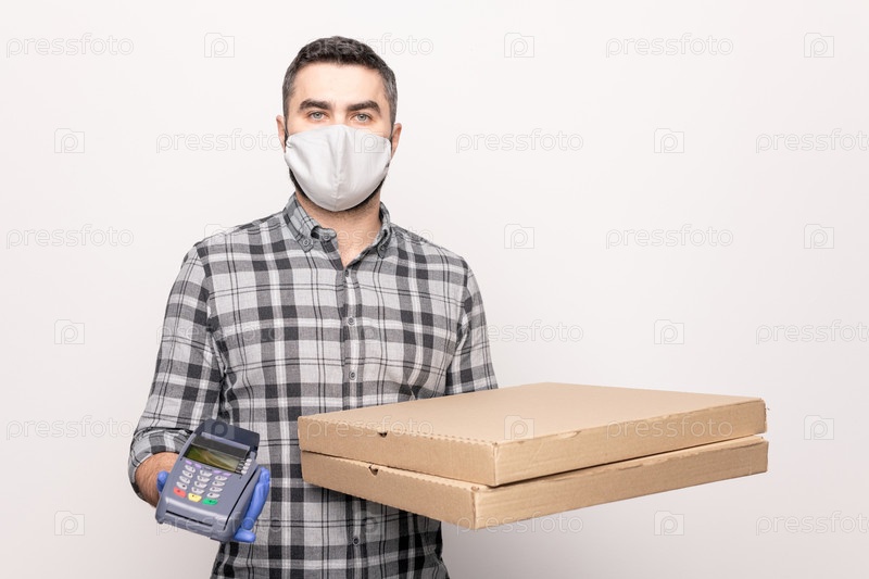 Молодой мужской курьер с двумя картонными коробками и платежным автоматом доставляет пиццу