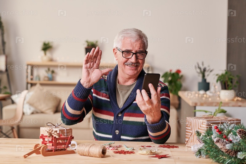 Веселый красивый старший мужчина с усами машет рукой, разговаривая с другом по видеолинку перед Рождеством